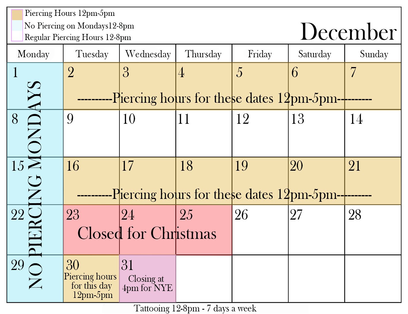 Every other week we will be Piercing from 12-5pm and still NO Piercing on Monday.